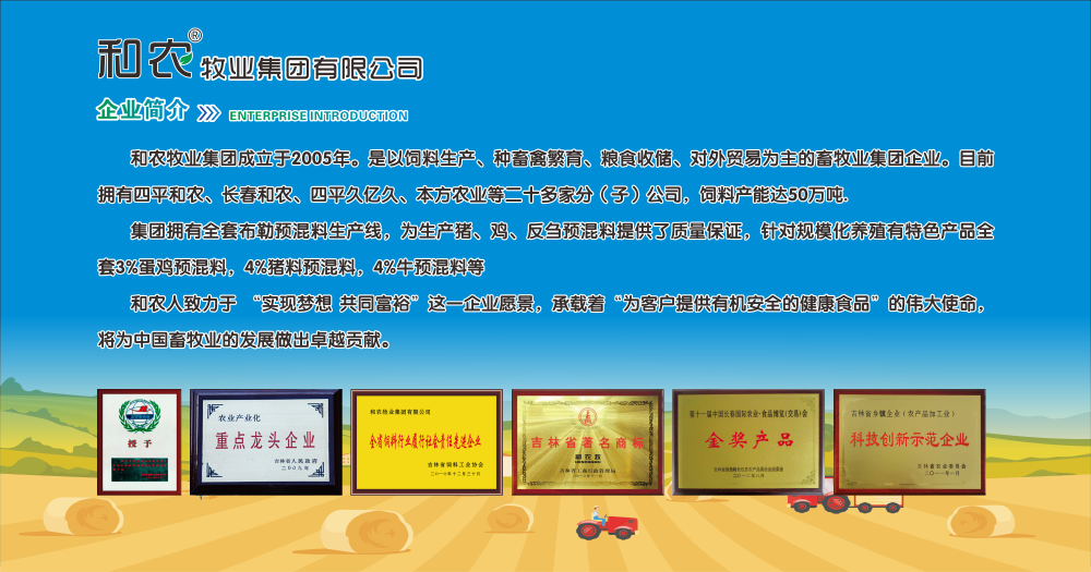 和農(nóng)牧業(yè)集團(tuán)成立于2005年,是以飼料生產(chǎn)、種畜禽繁育、糧食收儲(chǔ)、對(duì)外貿(mào)易為主的畜牧業(yè)集團(tuán)企業(yè)。飼料產(chǎn)能達(dá)50萬(wàn)噸,集團(tuán)擁有全套布勒預(yù)混料生產(chǎn)線,為生產(chǎn)豬、雞、反芻預(yù)混料提供了質(zhì)量保證,針對(duì)規(guī)?;B(yǎng)殖有特色產(chǎn)品全套3%蛋雞預(yù)混料,4%豬料預(yù)混料,4%牛預(yù)混料等。